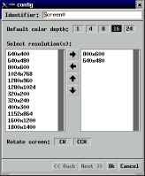 Haciendo click derecho sobre el monitor elegimos configure y podremos seleccionar la profundidad de colores y la resolución a la que querramos trabajar. Aqui vemos que se ha seleccionado 16 bits de profundidad de colores (65536 colores) y dos resoluciones, 640x480 y 800x600. Puede alternarse entre estas dos resoluciones apretando la cambinación de teclas Ctrl-Alt-+ y Ctrl-Alt--