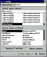 El primero se refiere al puerto físico que está conectado el mouse. Si se trata de un mouse serie el mismo será seguramente /dev/ttyS0 o /dev/ttyS1. Si se trata de un mouse ps2 será /dev/psaux. En cuanto al protocolo, puede dejarse en Auto la mayoría de las veces. Algunos protocolos pueden activar características especiales del mouse, por ejemplo la rueda. La opción Emulate 3 buttons permite que teniendo un mouse de dos botones, apretando los dos a la vez se comporte como un tercer botón.