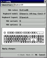 Las opcion xkb rules debe ser xfree86. Los parámetros más importantes son Keyboard model, el cual en los teclados comunes con "teclas muertas" (dead keys) que usa cierto sistema operativo será Generic 105-key (Intl) PC para teclado español (104-keys para uno americano), y Keyboard layout, en nuestro caso casi siempre Spanish.