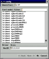 Este punto es crucial y por demás de complicado cuando no se tiene la documentación de la placa. Lo mejor que puede uno hacer es leer los README que vienen con X para ver si existe compatibilidad con nuestra placa de video. Si se sabe cual es el tipo de placa y esta aparece listada, es un procedimiento inmediato, pero si no se tendrá que probar con una placa genérica que supla los requerimientos de nuestra placa de video. A continuación vemos la pantalla de configuración de la placa de video.