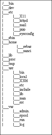 La mayoría de los sistema UNIX tienen una distribución estándar de ficheros, de esta forma los recursos que el sistema posee y los archivos, serán fácilmente localizados. Esta distribución forma el árbol de directorios, el cual comienza con "/", también conocido como "directorio raiz". Directamente por debajo de este hay algunos subdirectorios muy importantes para el sistema: Estos son /bin, /etc, /dev y /usr, entre otros. Estos a su ves contienen otros directorios con archivos de configuración del sistema, programas, etc.