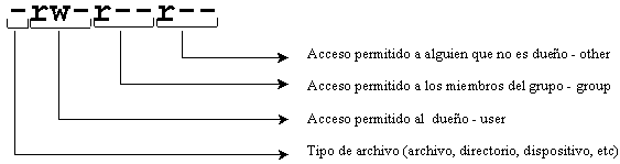 El tercer grupo de tres símbolos representa los permisos para todo el resto de los usuarios (other) en este caso es solo de lectura.