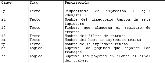 · if indica el nombre del filtro de impresión a ejecutar. Los filtros son programas que reciben datos por la entrada estándar, y los devuelven procesados por la salida estándar. Un empleo típico es detectar texto llano y convertirlo en PostScript para imprimirlo en ese tipo de trastos. Son muy útiles, por ejemplo, para eliminar el efecto escalera, o cambiar la página de códigos sin necesidad de cambiar la configuración de la impresora cada vez que la usemos entre UNIX y DOS. Cuando se especifica un filtro de entrada, el demonio de impresión no envía los datos pendientes al dispositivo especificado. En su lugar, arranca el filtro y asigna el fichero temporal a la entrada estándar, y el dispositivo de impresión como salida estándar.Probemos /etc/printcap con un ejemplo:· rm y rp controlan el destino de la impresión remota. Enviar el documento a imprimir a una impresora remota es tan fácil como indicar el anfitrión en rm, la impresora correspondiente en rp, y asegurarse que lp está vacío. Fíjese en que los datos se tamponan localmente antes de ser enviados, y que le ejecutará cualquier filtro que especifique. Una entrada típica de /etc/printcap en la máquina local (pera.huerta.net) para trabajar sobre la impresora picapapel, en la estación rábano.huerta.net (remota), sería: picapapel:lp=:rm=rábano.huerta.net:rp=picapapel:sd=/var/spool/lpd/picapapel: En la máquina remota necesitará que /etc/hosts.equiv o /etc/hosts.lpd contenga la línea pera.huerta.net; Tenga cuidado con los permisos de acceso.