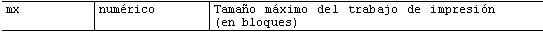 · mx limita el tamaño del spool de datos, señalando una cantidad en bloques de 1 K ( 1024 bits ). Si mx=0, el límite viene dado por el espacio disponible en disco. Recuerde que lo que limitamos es el tamaño del spool, no la cantidad de datos impresos. Si intentamos sobrepasar el límite, el fichero simplemente se trunca, y el usuario recibe el mensaje